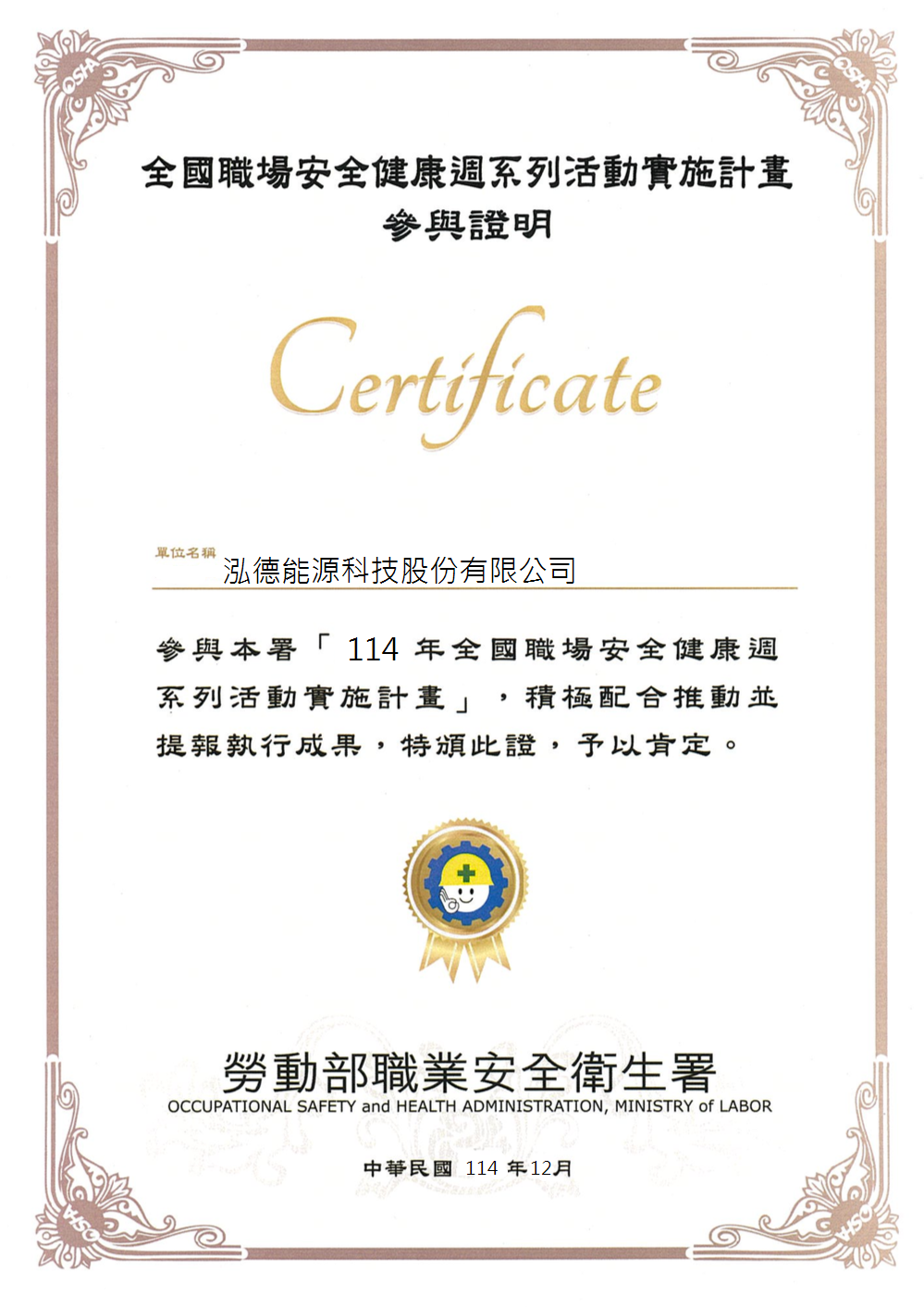 勞動部職安署頒發《113年全國職場安全健康週系列活動實施計畫》參與證明